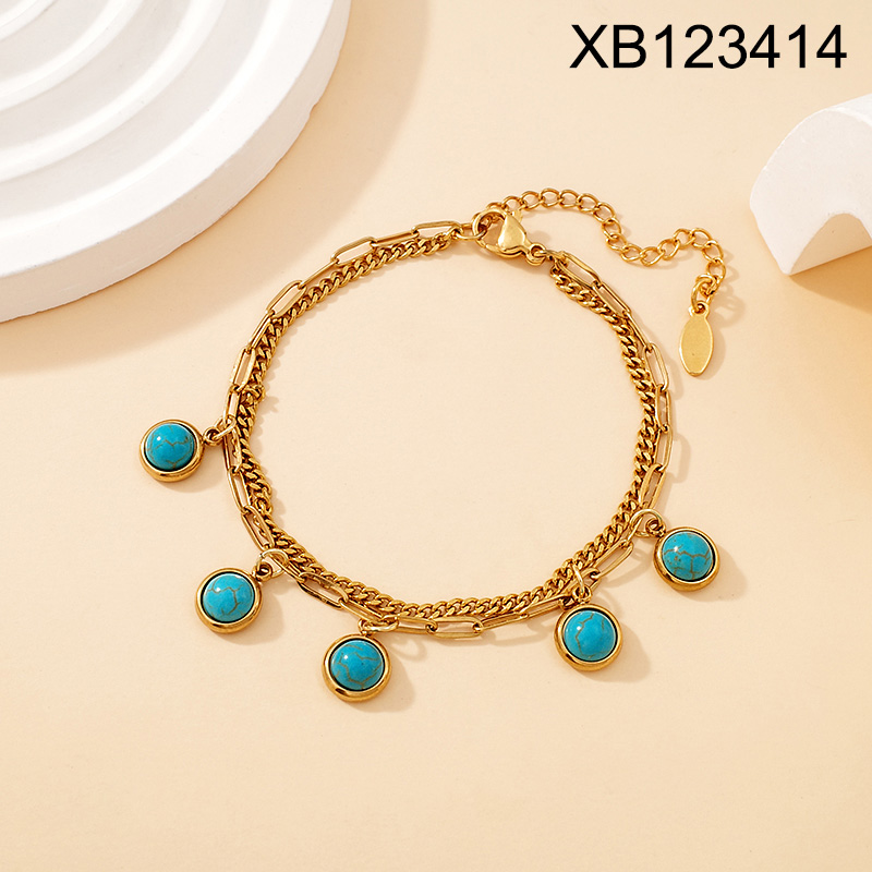 Home > Level B Stainless Steel New Trendy Women Jewelry Two Layers Chain Round Turquoise Golden Bracelet