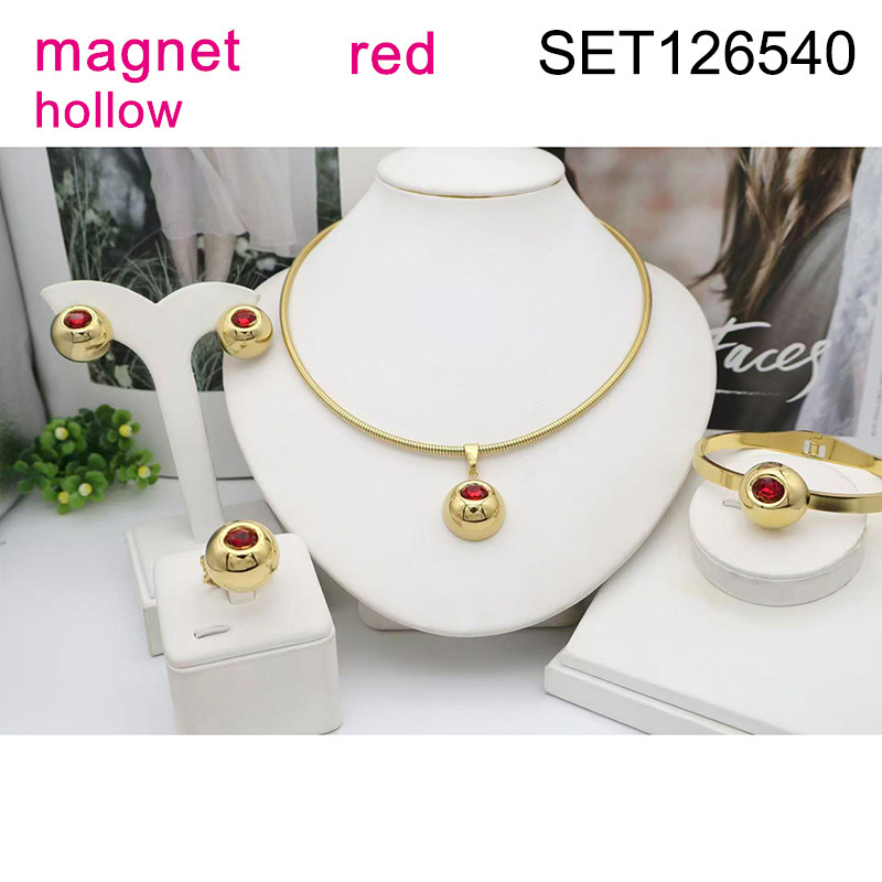 Level B Stainless Steel New Trendy Women Jewelry Hollow Round Red Stone Golden Magnet buckle 4pcs SET