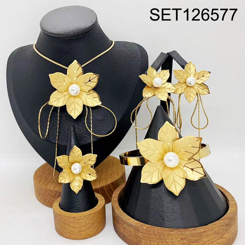Level B Stainless Steel New Trendy Women Jewelry Pearl Style/Plastic Beads Flower Golden 4pcs SET