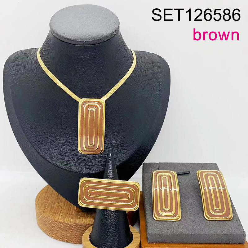 Level B Stainless Steel New Trendy Women Jewelry Drip Oil/Enamel Brown Rectangle Golden 3pcs SET