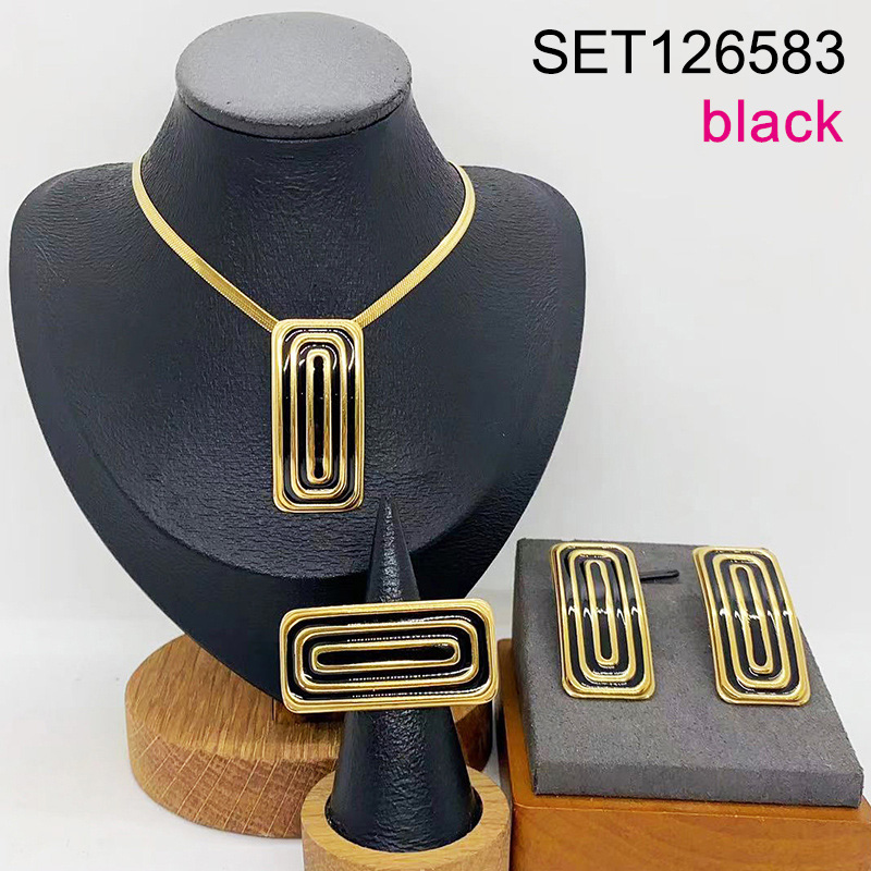 Level B Stainless Steel New Trendy Women Jewelry Drip Oil/Enamel Black Rectangle Golden 3pcs SET