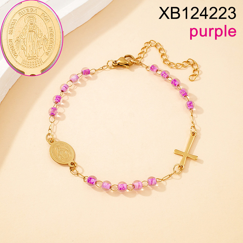 Level B Stainless Steel New Trendy Women Jewelry Purple Bead Chain Religion Cross Golden Bracelet