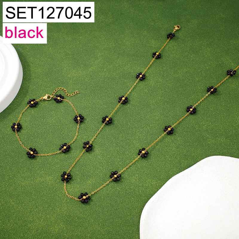 Level B Stainless Steel New Trendy Women Jewelry Black Glass beads Flower Golden Chain SET