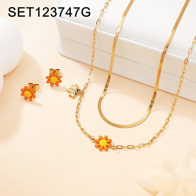 Home > Level A Stainless Steel New Trendy Women Jewelry Two Layers Chain Drip Oil/Enamel Flower Animal Bee Golden SET