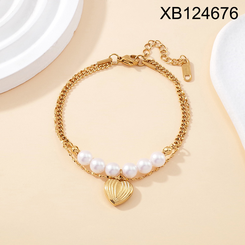 Level B Stainless Steel New Trendy Women Jewelry Two Layers Chain Pearl Style/Plastic Beads Heart Golden Mother's Day Bracelet