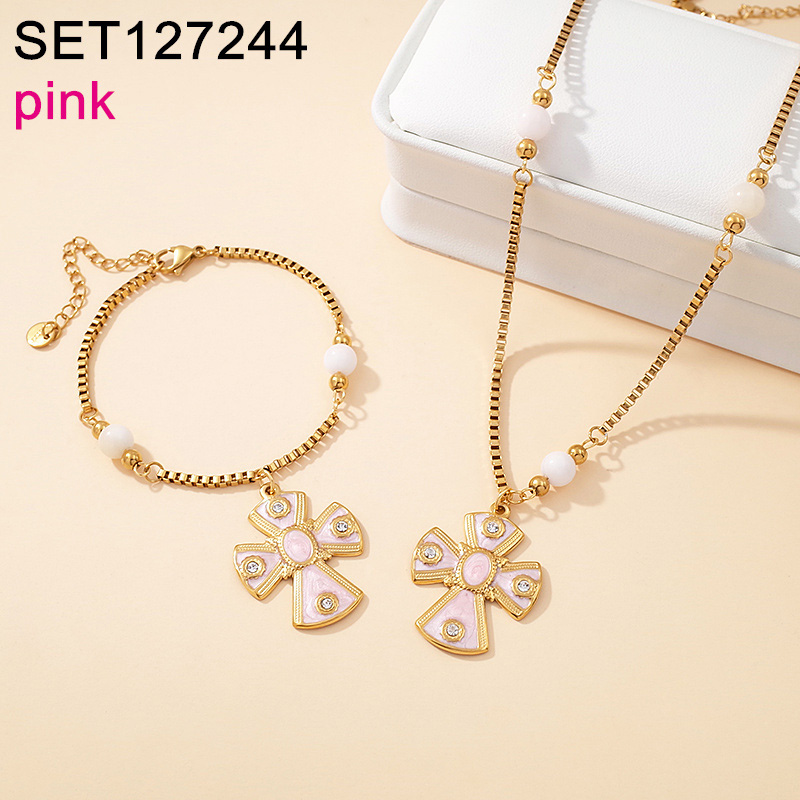 Level B Stainless Steel New Trendy Women Jewelry Drip Oil/Enamel Cross Golden Chain SET
