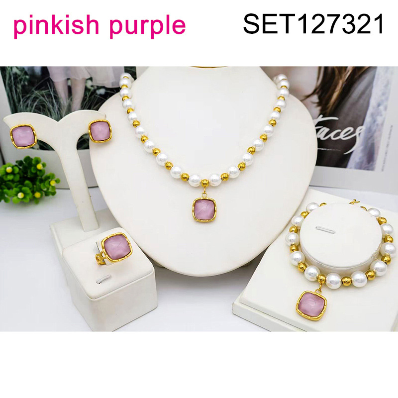 Level B Stainless Steel New Trendy Women Jewelry Pearl Style/Plastic Beads Square Pinkish purple Opal Golden 4pcs SET