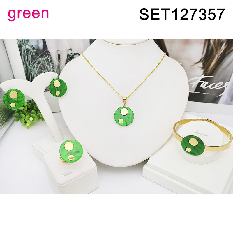 Level B Stainless Steel New Trendy Women Jewelry Green Round Resin Golden 4 pcs SET