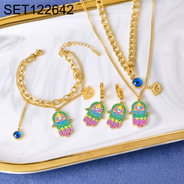 Home > Stainless Steel Sets > Epoxy Jewelry > Level B Stainless Steel Jewelry New Trendy Drip Oil/Enamel Hamsa Hand Palm Golden 3pcs SET