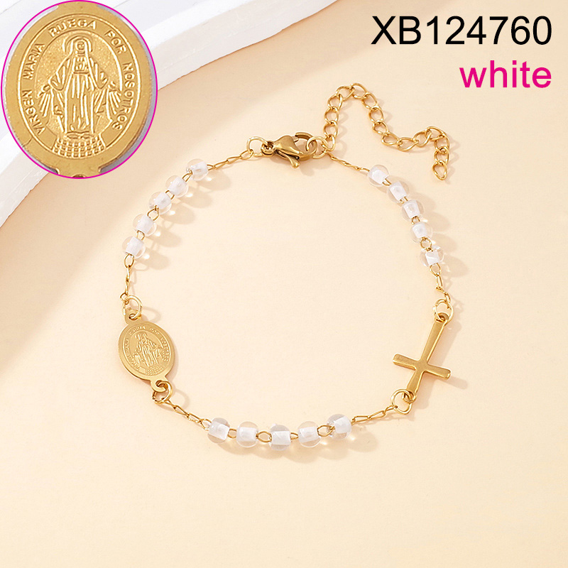 Level B Stainless Steel New Trendy Women Jewelry White Bead Chain Religion Cross Golden Bracelet