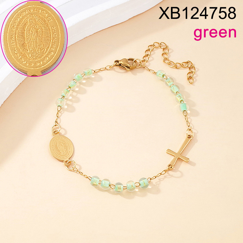 Level B Stainless Steel New Trendy Women Jewelry Green Bead Chain Religion Cross Golden Bracelet
