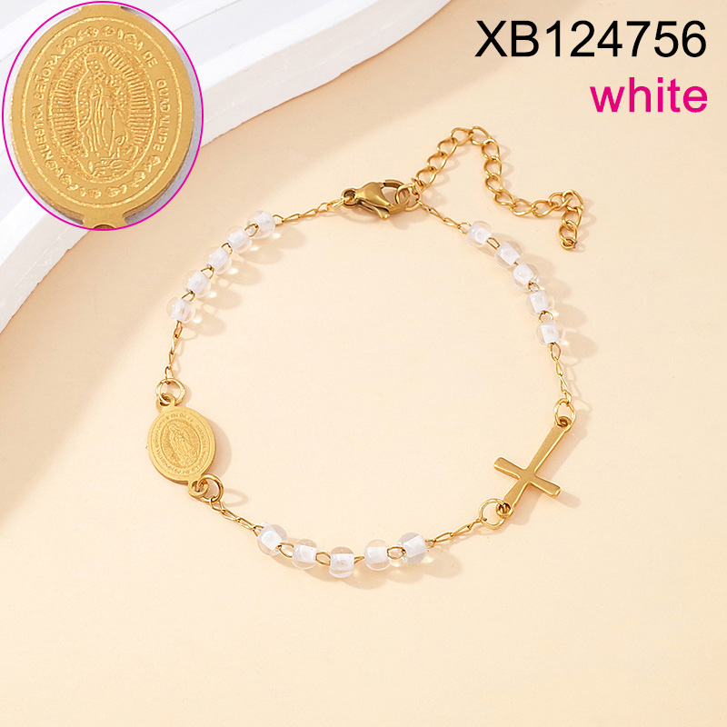 Level B Stainless Steel New Trendy Women Jewelry White Bead Chain Religion Cross Golden Bracelet