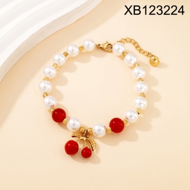 > Level A Stainless Steel New Trendy Women Jewelry Pearl Style/Plastic Beads Summer fruit style Cherry Golden Bracelet