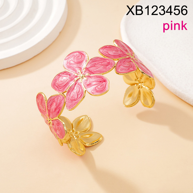 Level C Stainless Steel New Trendy Women Jewelry Drip Oil/Enamel Flower Golden Open Bangle;Bangle size can be adjusted freely