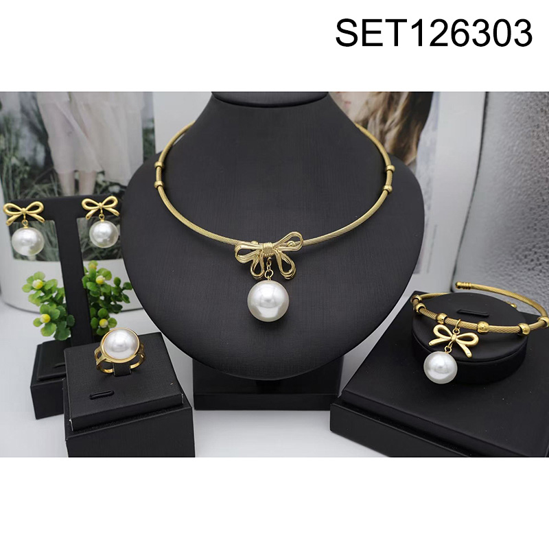 Home > Stainless Steel Sets > 4pcs Sets > Level B Stainless Steel New Trendy Women Jewelry Pearl Style/Plastic Beads Bowknot Golden Magnet buckle 4pcs SET