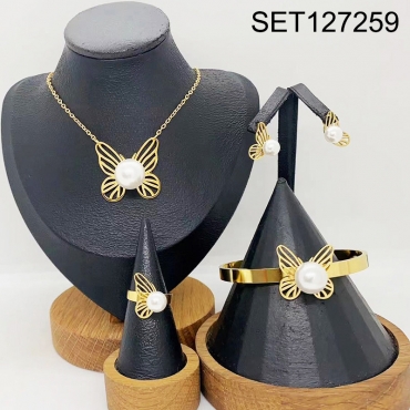 Home > Stainless Steel Sets > 4pcs Sets > Level B Stainless Steel New Trendy Women Jewelry Pearl Style/Plastic Beads Animal Butterfly Golden 4pcs SET