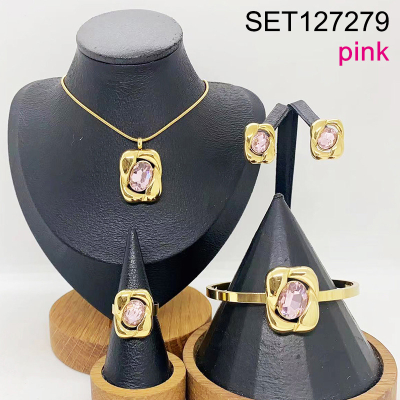 Level B Stainless Steel New Trendy Women Jewelry Pink Stone Geometry Golden 4pcs SET