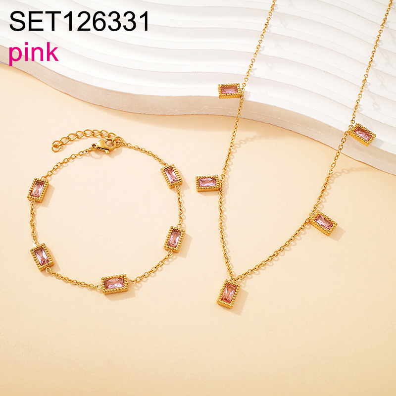 Home > Stainless Steel Sets > Necklaces & Bracelets > Level B Stainless Steel New Trendy Women Jewelry Rectangle Pink Crystal zirconium Golden Chain SET