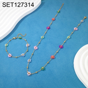 Home > Stainless Steel Sets > Necklaces & Bracelets > Level B Stainless Steel New Trendy Women Jewelry Mixed color Flower Golden Chain SET