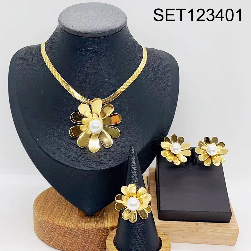 Level B Stainless Steel New Trendy Women Jewelry Pearl Style/Plastic Beads Flower Golden 3pcs SET