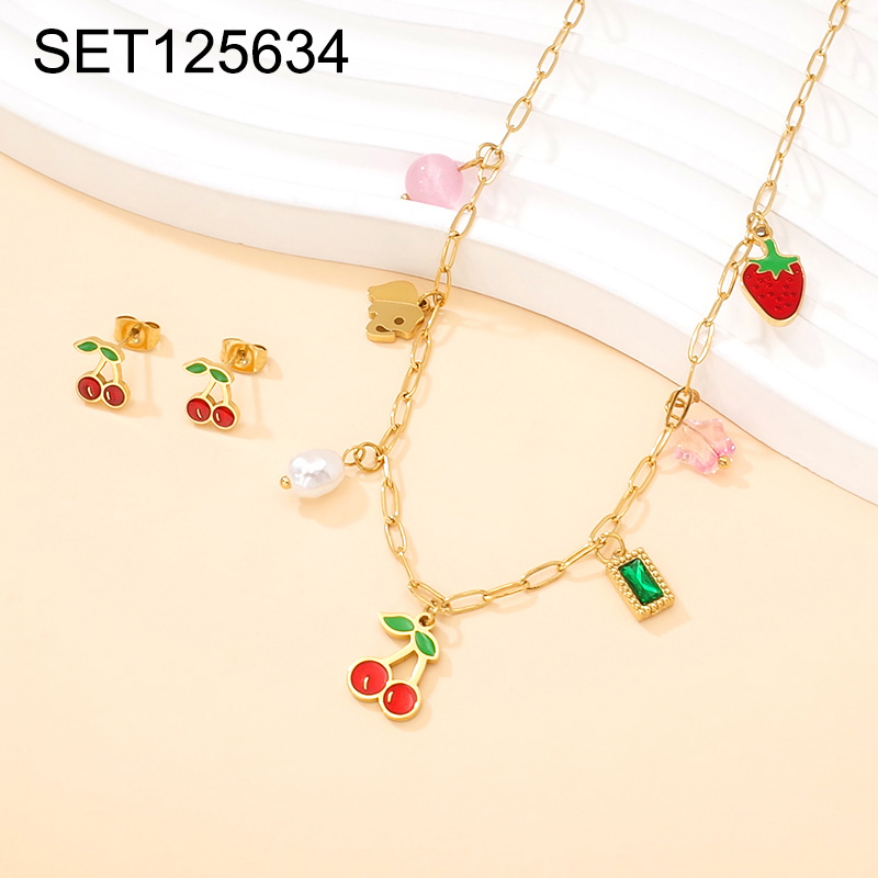 Level B Stainless Steel New Trendy Women Jewelry Drip Oil/Enamel Summer fruit style Cherry Strawberry Golden SET