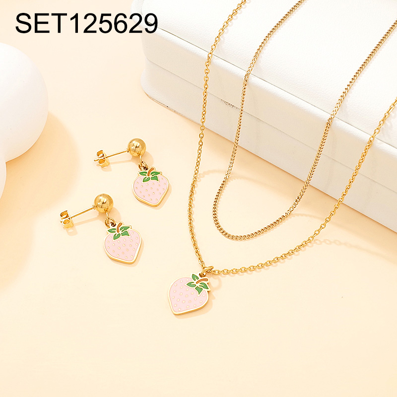 Home > Level B Stainless Steel New Trendy Women Jewelry Two Layers Chain Drip Oil/Enamel Summer fruit style Strawberry Golden SET