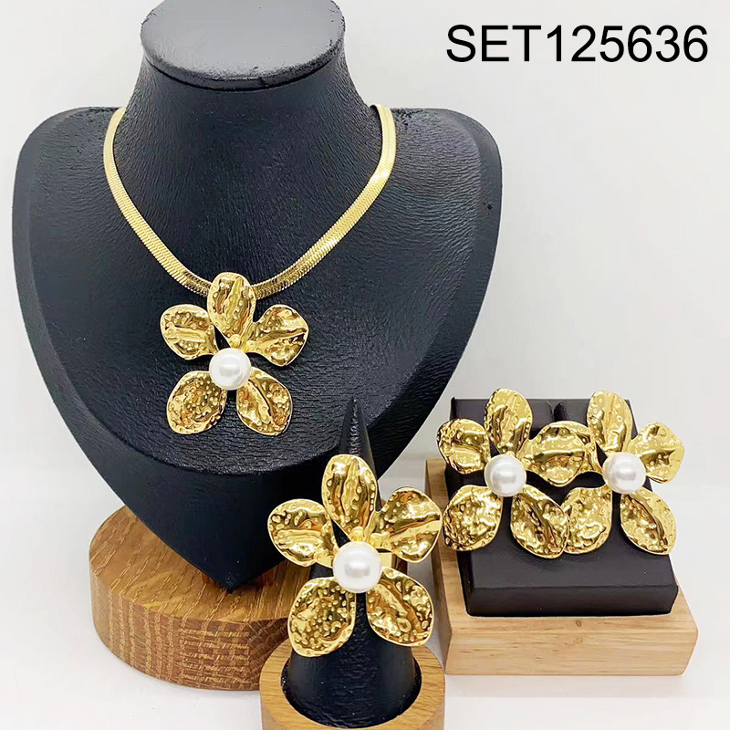 Level B Stainless Steel New Trendy Women Jewelry Pearl Style/Plastic Beads Flower Golden 3pcs SET