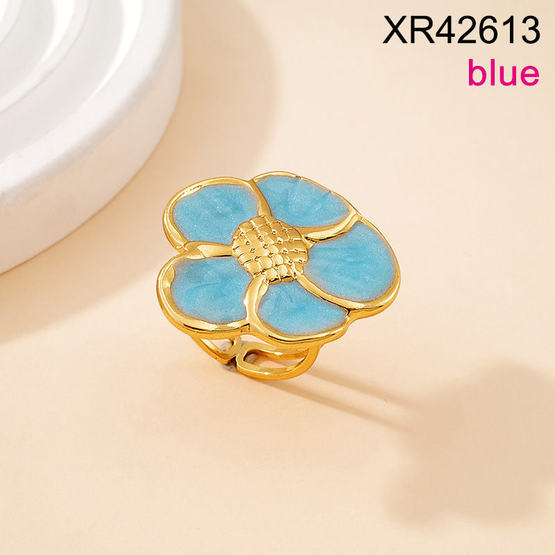 Level B Stainless Steel New Trendy Women Jewelry Drip Oil/Enamel Blue Flower Golden Open Rings;Ring size can be adjusted freely