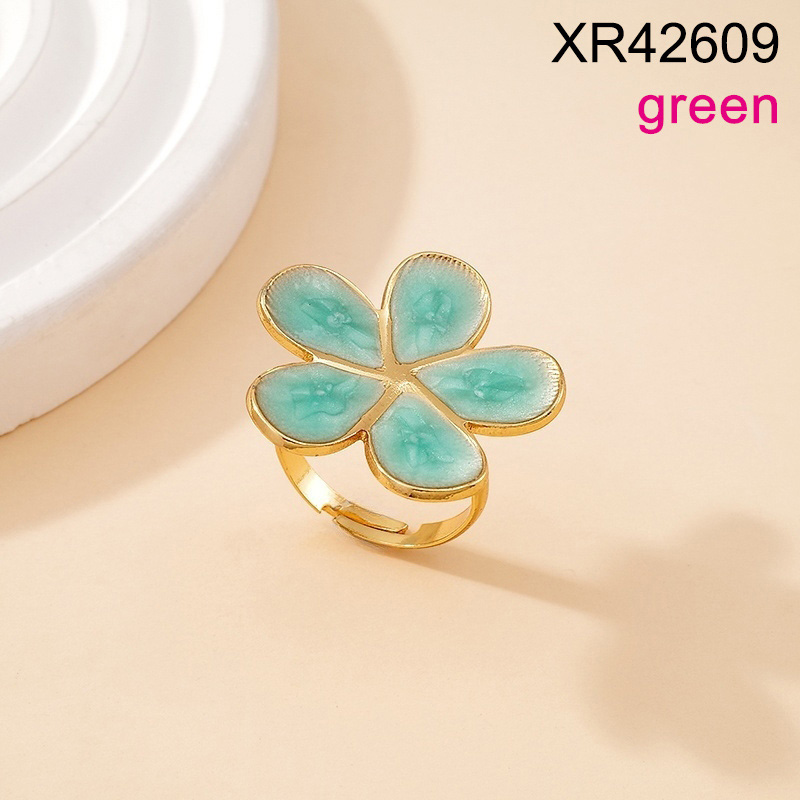 Level B Stainless Steel New Trendy Women Jewelry Drip Oil/Enamel Green Flower Golden Open Rings;Ring size can be adjusted freely