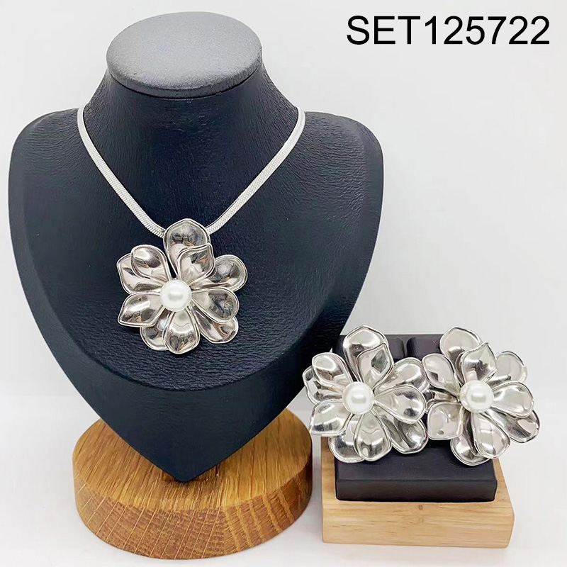Level B Stainless Steel New Trendy Women Jewelry Pearl Style/Plastic Beads Flower Steel color SET
