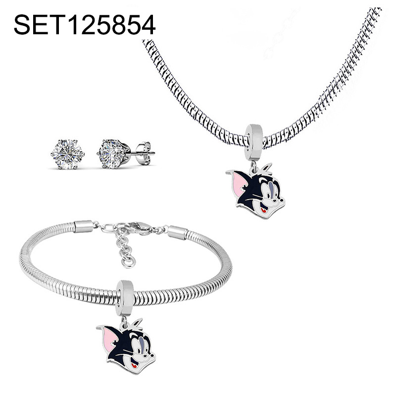 Level B Stainless Steel New Trendy Children Jewelry Drip Oil/Enamel Cartoon Animal Cat Steel color 3pcs SET