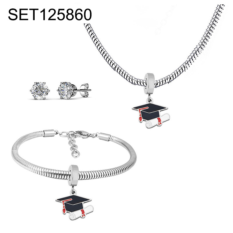 Level B Stainless Steel New Trendy Children Jewelry Drip Oil/Enamel Mortarboard Steel color 3pcs SET