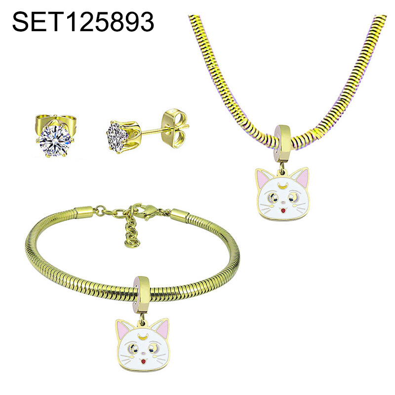 Level B Stainless Steel New Trendy Children Jewelry Drip Oil/Enamel Cartoon Animal Cat Golden 3pcs SET
