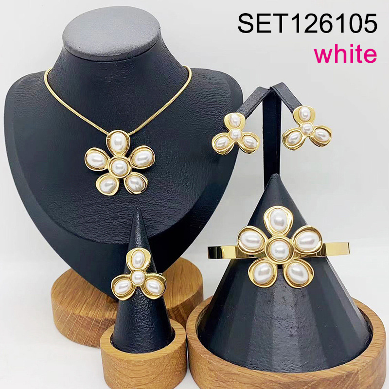 Level B Stainless Steel New Trendy Women Jewelry Pearl Style/Plastic Beads White Flower Golden 4pcs SET