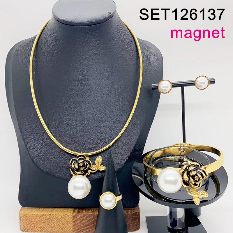 Level B Stainless Steel New Trendy Women Jewelry Pearl Style/Plastic Beads Flower Golden Magnet buckle 4pcs SET