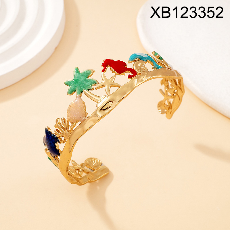 Level B Stainless Steel New Trendy Women Jewelry Summer beach Tree Animal Seahorse Dolphin Shell Golden Open Bangle;Bangle size can be adjusted freely