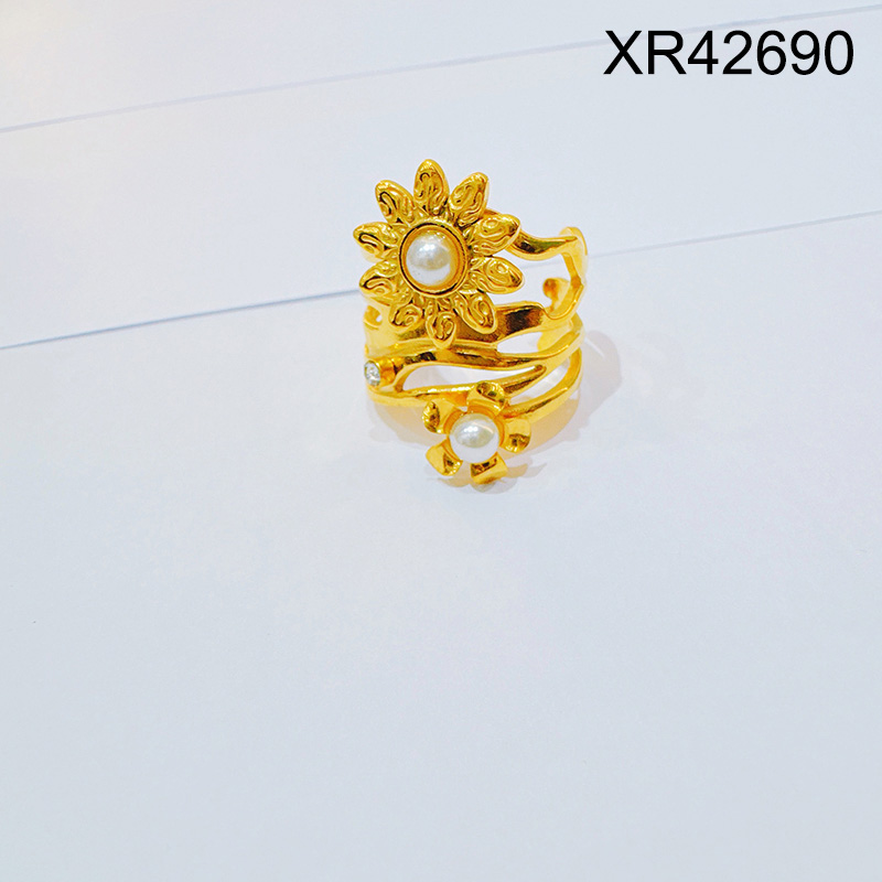 Level B Stainless Steel New Trendy Women Jewelry Pearl Style/Plastic Beads Flower Golden Open Rings;Ring size can be adjusted freely
