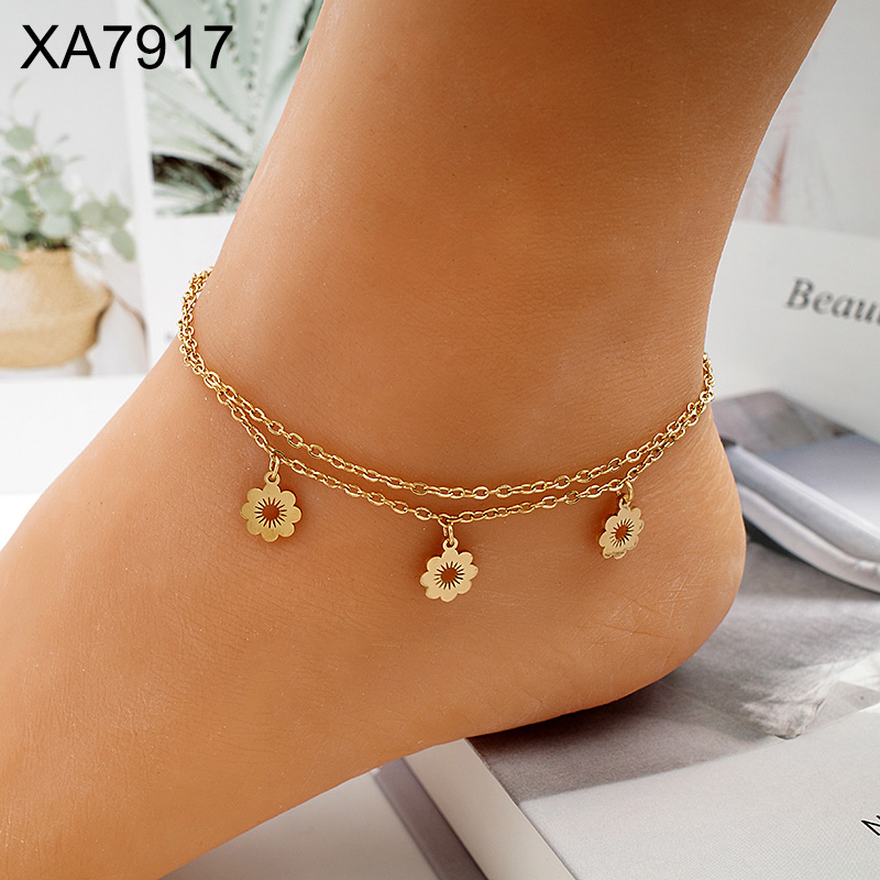 Level B Stainless Steel New Trendy Women Jewelry Two Layer Chain Golden Flower Anklet