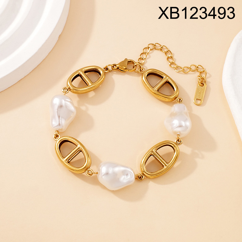 Level B Stainless Steel New Trendy Women Jewelry Pearl Style/Plastic Beads Oval Pig nose Golden Bracelet