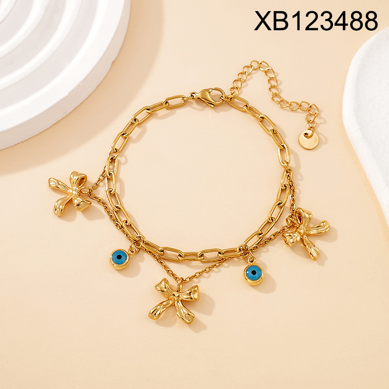 Level B Stainless Steel New Trendy Women Jewelry Two Layers Chain Bowknot Eye Golden Bracelet