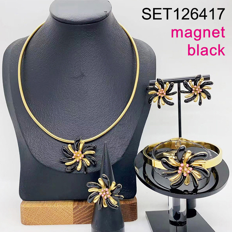 Home > Level B Stainless Steel New Trendy Women Jewelry Drip Oil/Enamel Black Flower Golden Magnet buckle 4pcs SET
