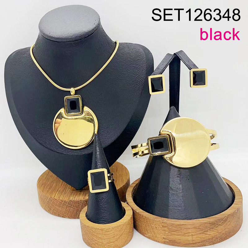 Level B Stainless Steel New Trendy Women Jewelry Round Rectangle Black Stone Golden 4pcs SET