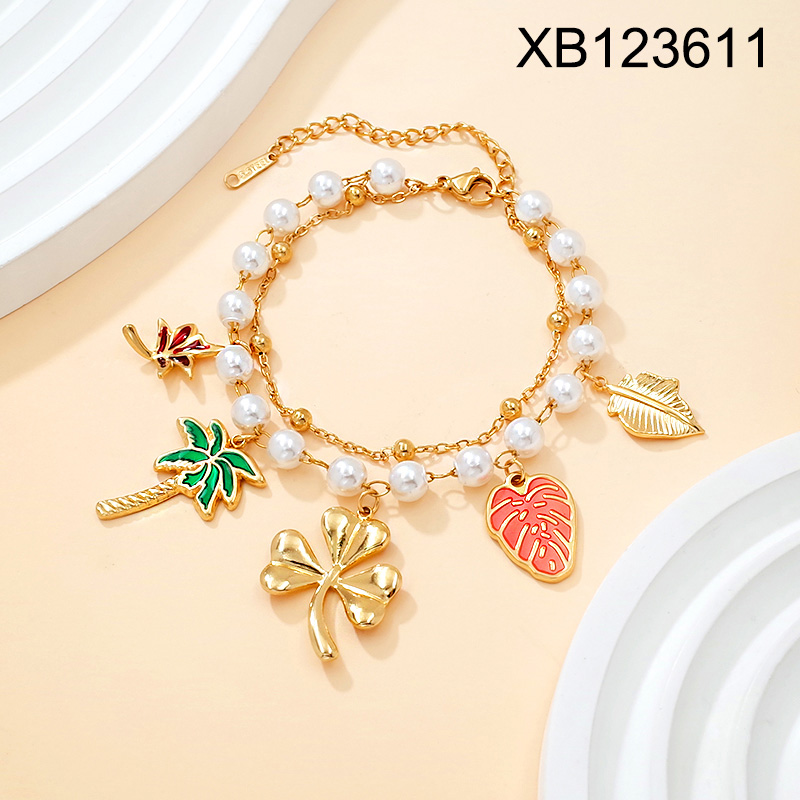 Level B Stainless Steel New Trendy Women Jewelry Two Layers Chain Pearl Style/Plastic Beads SYC Coconut Tree Leaf Golden Bracelet