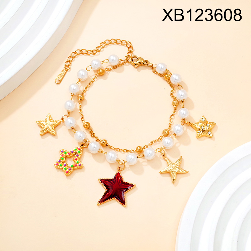 Level B Stainless Steel New Trendy Women Jewelry Two Layers Chain Pearl Style/Plastic Beads Star Golden Bracelet
