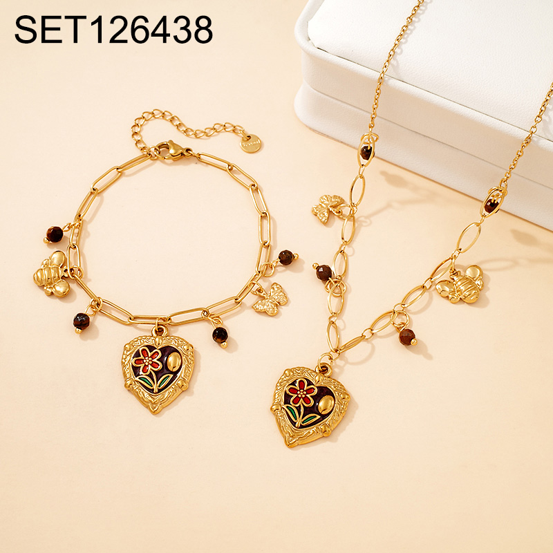 Level B Stainless Steel New Trendy Women Jewelry Drip Oil/Enamel Heart Animal Butterfly Bee Golden Chain SET