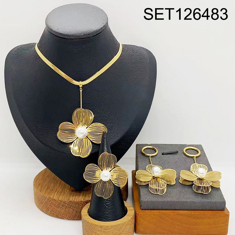 Level B Stainless Steel New Trendy Women Jewelry Pearl Style/Plastic Beads Flower Golden 3pcs SET