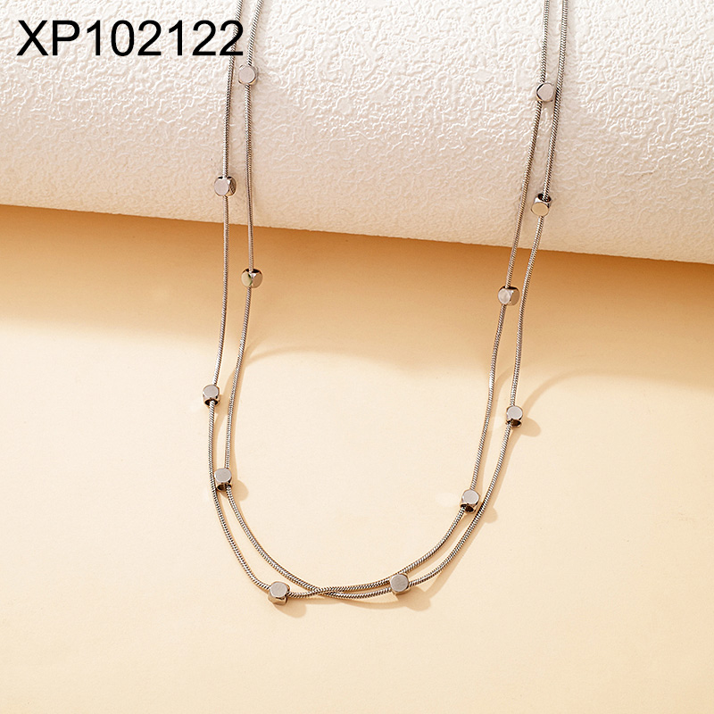 Level B Stainless Steel New Trendy Women Jewelry Two Layers Chain Cube Steel color Pendant