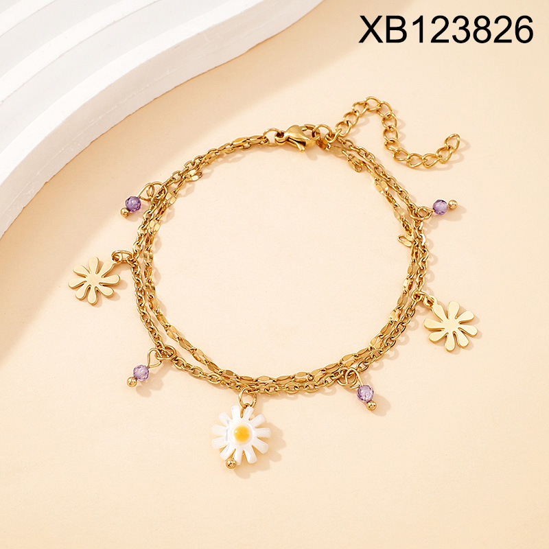 Level B Stainless Steel New Trendy Women Jewelry Two Layers Chain Flower Golden Bracelet
