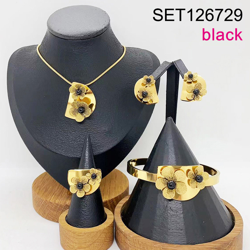 Level B Stainless Steel New Trendy Women Jewelry Pearl Style/Black Plastic Beads Flower Golden 4pcs SET