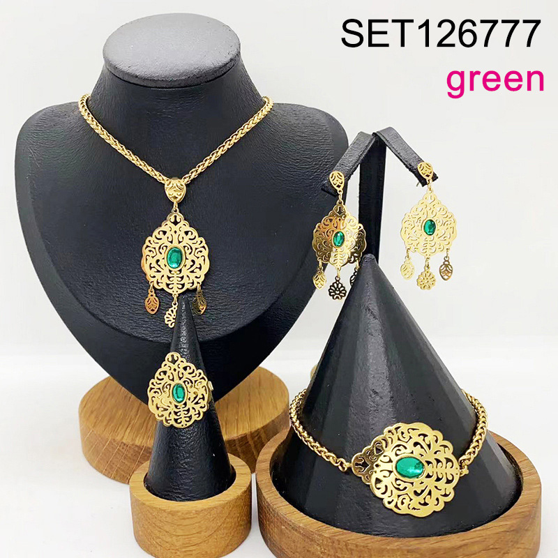 Level B Stainless Steel New Trendy Women Jewelry Green Stone Water Drip Golden 4pcs SET